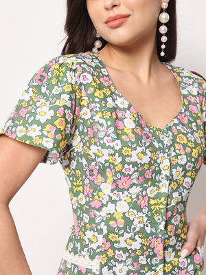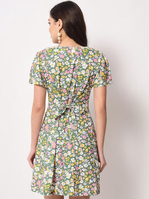 TRENDARREST Women's Rayon Green Floral Printed Short Dress